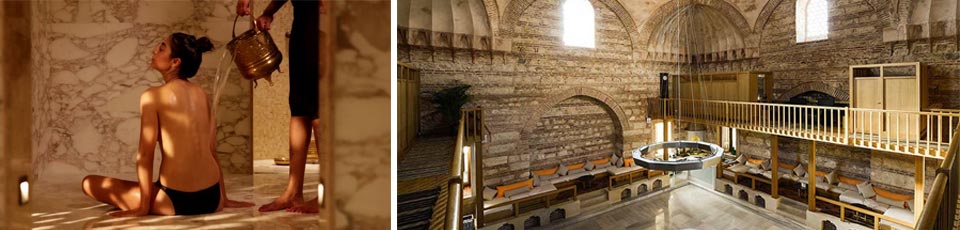 The traditional Turkish bath always has two separate structures for men and women, which begin the path wrapped in the pestemal - the cloth that is provided at the entrance. After having changed and placed the pestemal, first pass through the tepidarium and then the calidarium, where in the center is the "göbek tasi" (umbilical stone in Turkish), a large marble platform heated from below. He lies on this platform after washing himself and he starts to sweat from the steam, after which you will receive a massage from the same sex staff. The massage is done on the whole body with the "Kese", the glove that makes your skin extraordinarily soft by removing the dead layer. And after the massage, you go from the tepidarium to a room where you sit and relax a little.